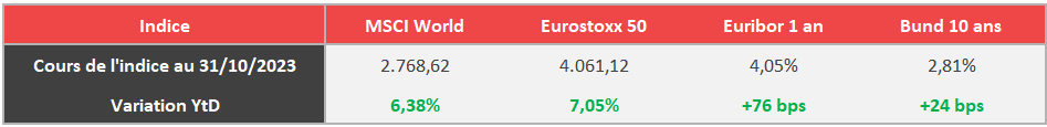 - 26 Octobre – ECB : Dans un communiqué de presse, il est annoncé que le taux d’intérêt des opérations principales de refinancement, ceux de la facilité de prêt marginal et ceux de la facilité de dépôt restent inchangés (à respectivement 4,50%, 4,75 % et 4,00 %). restent inchangés.